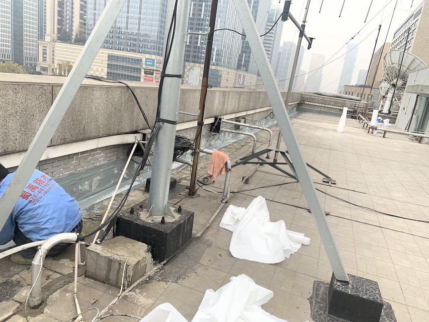 我公司承接的成都市人防辦辦公樓屋面防水維修工程,此工程地點(diǎn)位于四川省成都市武侯區(qū)錦城大道,此處房屋修建已有一些年限了,屋頂漏水比較厲害,業(yè)主方之前找其他公司采用SBS改性瀝青防水卷材處理過(guò),但是并未解決到問(wèn)題,經(jīng)過(guò)我公司人員現(xiàn)場(chǎng)實(shí)際勘察情況,此屋頂有一定特殊性,屋頂?shù)目照{(diào)等一些機(jī)械設(shè)備較多,并且機(jī)械設(shè)備離地間隙較小,采用傳統(tǒng)的SBS改性瀝青防水卷材根本無(wú)法將機(jī)械設(shè)備下面做到完好的情況,故而采用傳統(tǒng)材料無(wú)法解決到問(wèn)題,我公司根據(jù)實(shí)際情況,制定的方案是,采用聚合物水泥防水涂料配合專(zhuān)用的縫織聚酯布涂刷施工,最后表層再做專(zhuān)門(mén)用于裸露表面的耐紫外線抗老化的SYR金屬屋面專(zhuān)用防水涂料,由于采用的是防水涂料涂刷施工,機(jī)械設(shè)備下面的部位都完好的做好了,一次性**的解決到了問(wèn)題。