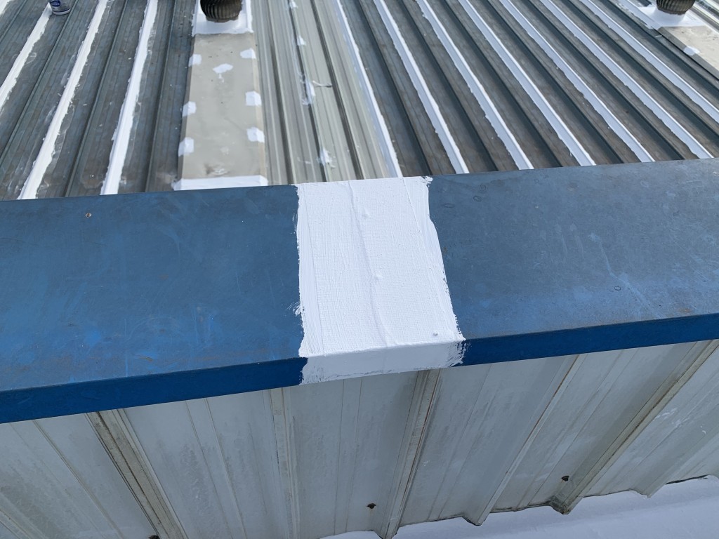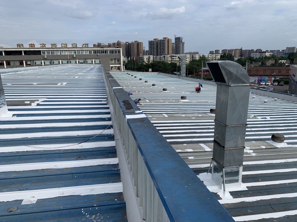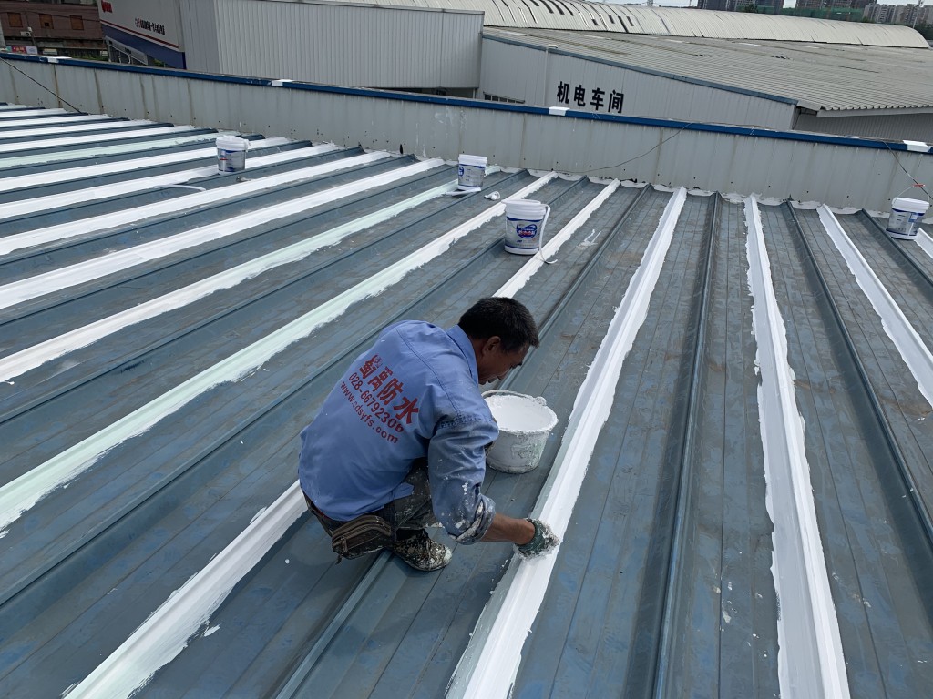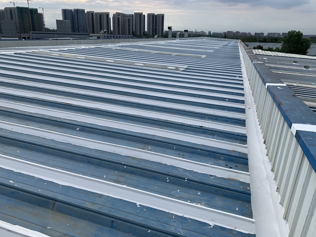 我公司采用的SYR金屬屋面專用防水涂料配合專用縫織聚酯布一布三涂形成的SYR金屬屋面專用防水系統具有防水、防腐、抗紫外線、反射隔熱的效果,特別適合于暴露屋面的使用,耐久性佳。