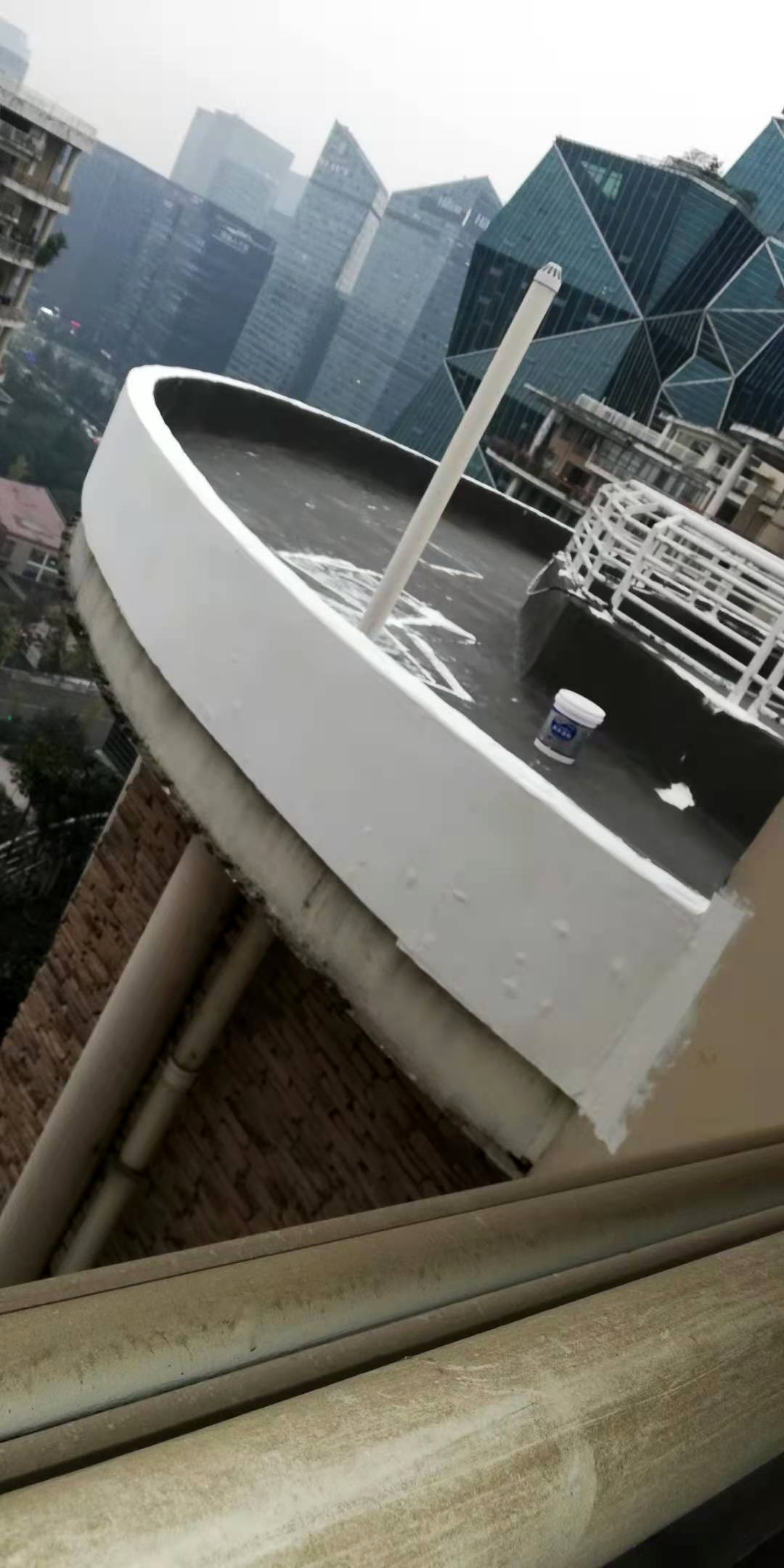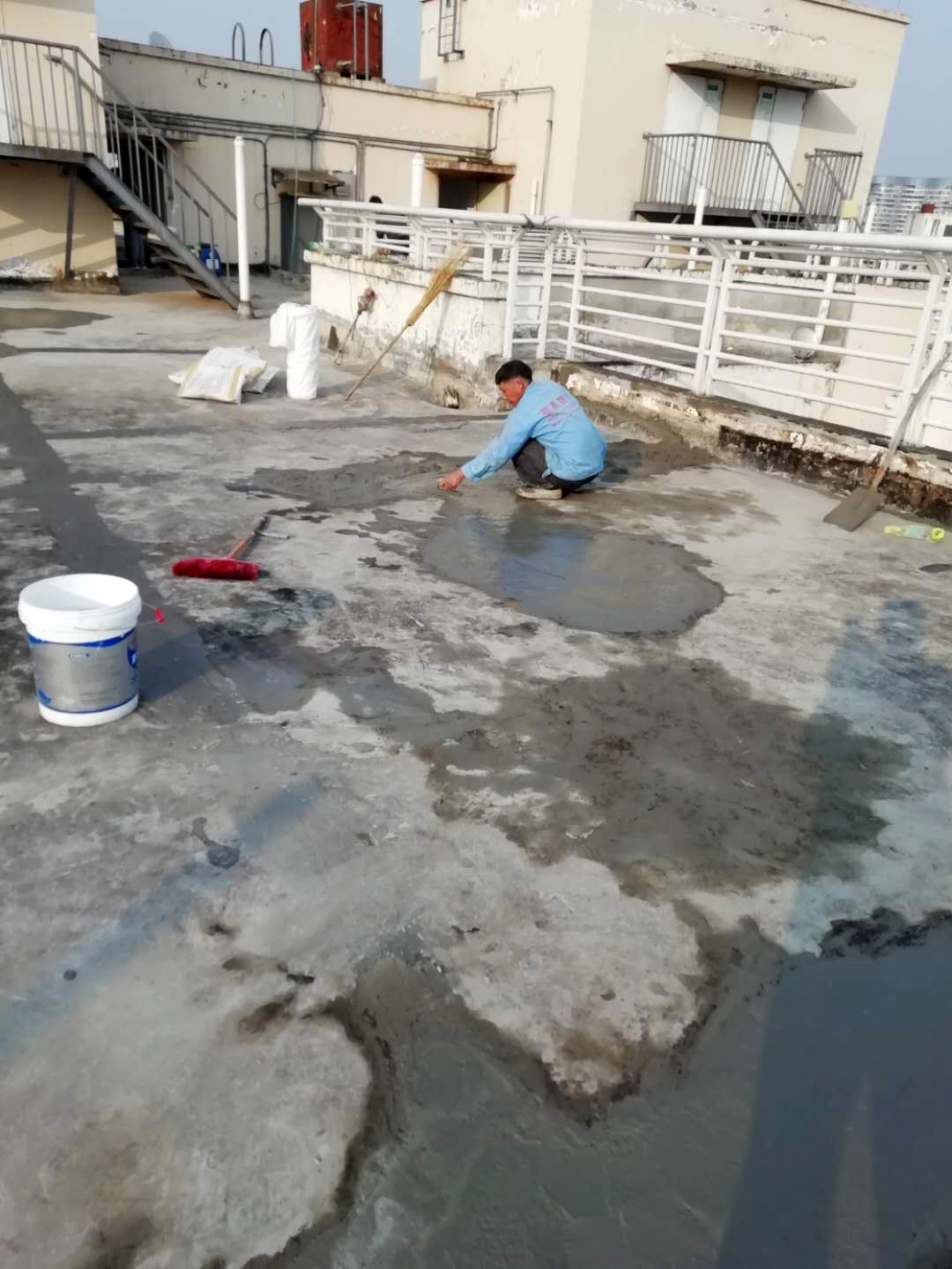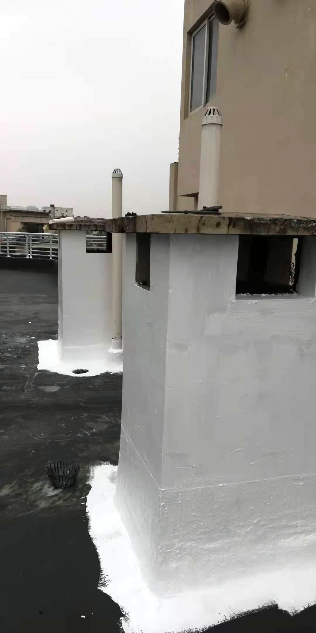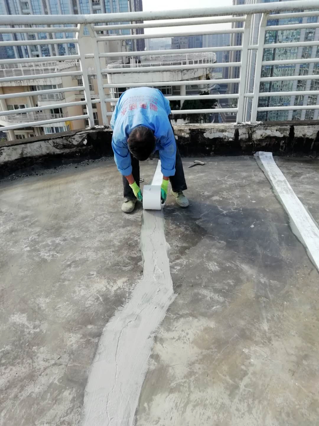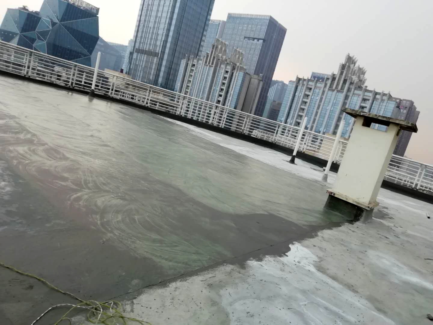 成都市天府大道天鵝湖花園2棟與10棟屋頂存在漏水的現(xiàn)象,經(jīng)過我公司技術(shù)人員到達(dá)現(xiàn)場(chǎng)查勘情況,為屋頂原防水層有破損漏水問題,并且屋頂?shù)脑Wo(hù)層也有很多翻砂起殼根據(jù)現(xiàn)場(chǎng)實(shí)際情況,我公司根據(jù)現(xiàn)場(chǎng)實(shí)際情況制定的方案為,將屋頂表面已破損的砂漿保護(hù)層進(jìn)行修補(bǔ)處理,先采用聚合物水泥防水涂料配合防水專用縫織聚酯布對(duì)基層表面裂縫進(jìn)行加強(qiáng)處理,然后整個(gè)屋面采用蜀禹公司的國(guó)標(biāo)I型聚合物水泥防水涂料配合防水專用縫織聚酯布一布三涂方式進(jìn)行防水施工,待干后表面再涂刷SYR金屬屋面專用防水涂料,最后表面再涂刷蜀禹透明高分子防水液罩面層。