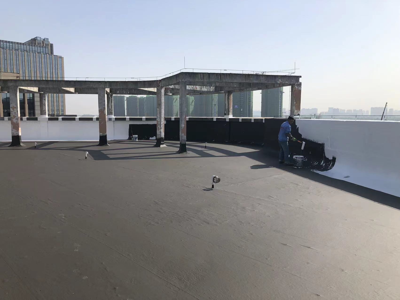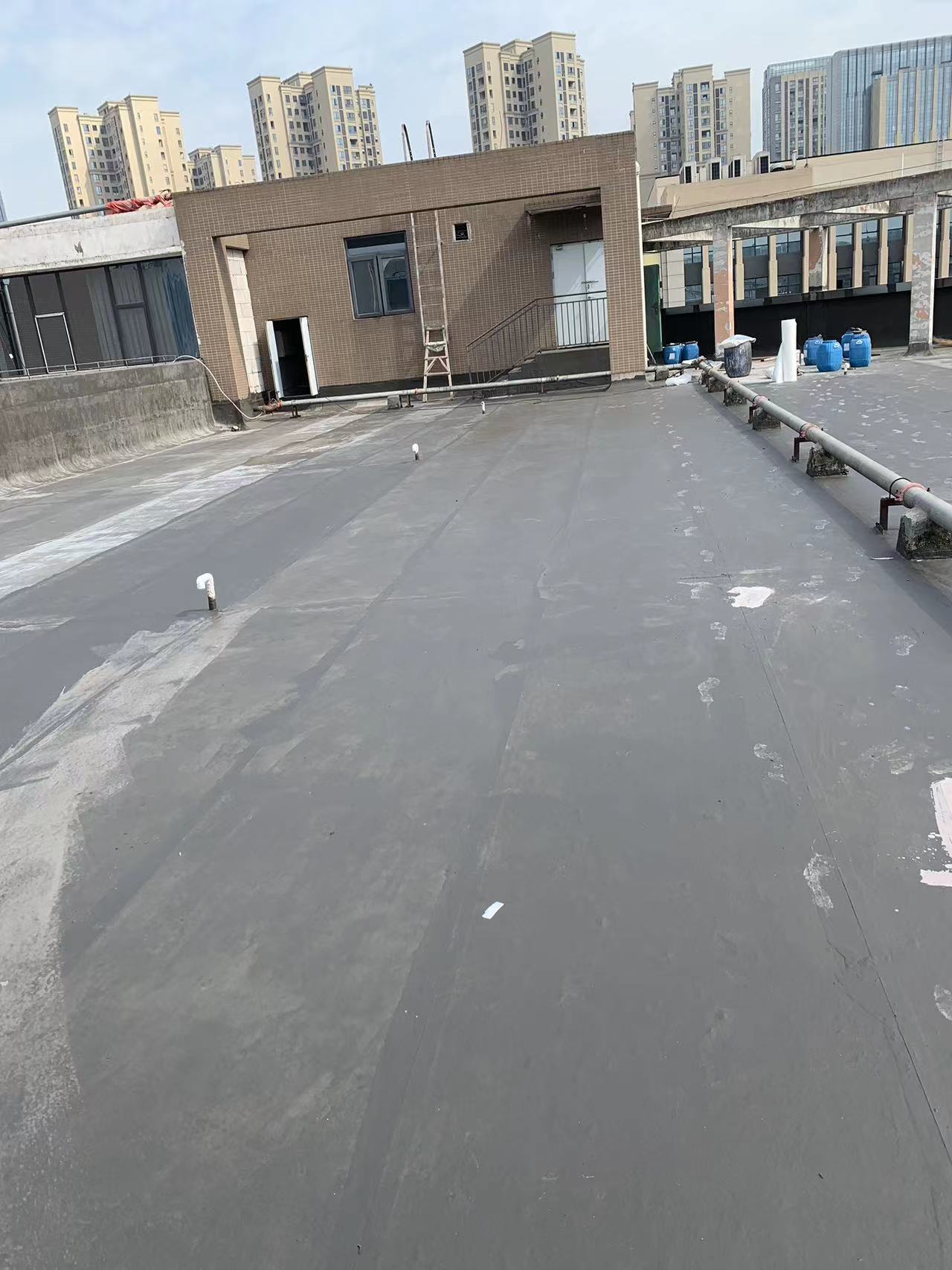 我公司現場施工工藝流程為:先將屋頂基層起殼易脫落的清理掉,破損部位水泥砂漿局部修補,然后基層表面滿涂刷混凝土液體硬化劑進行基層固化處理,這樣處理的好處是,后面做的防水層能夠與基層牢牢的粘結在一起;待混凝土液體硬化劑固化之后,屋頂的地面及墻面全部滿涂刷蜀禹Ⅰ型聚合物水泥防水涂料然后滿鋪貼專用的縫織聚酯布再涂刷蜀禹Ⅰ型聚合物水泥防水涂料,待干后表面涂刷蜀禹Ⅰ型聚合物水泥防水涂料,等待干后表面再涂刷兩道SYR金屬屋面防水涂料涂層。施工完畢之后,等待施工的防水涂層干透之后,屋頂做閉水試驗一星期后不漏水驗收合格之后交驗。