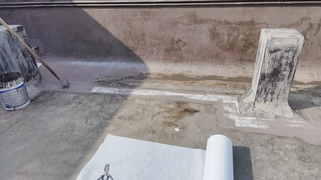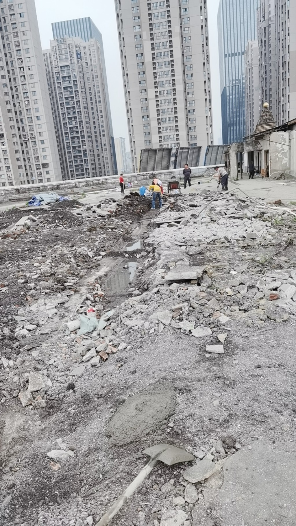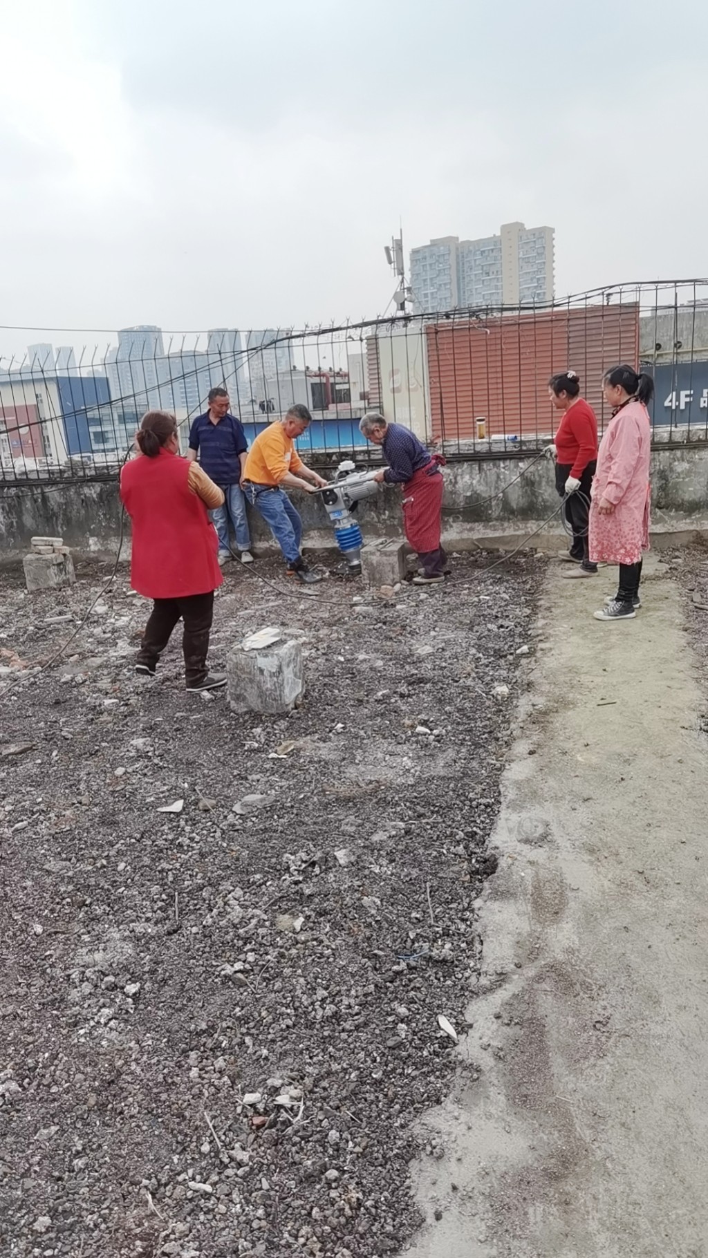 這個工程具有相當大的施工難度,主要是因為屋頂修建了很多花臺,并貼了瓷磚,導致屋頂非常雜亂。為了確保工程的順利進行,在施工前,我們首先將屋頂?shù)幕ㄅ_拆除,地面的瓷磚以及剛性保護層拆除,并將建渣搬運下樓清運出場。待地面平整好后,我們在基層表面滾涂混凝土液體硬化劑,對基面進行固化處理。