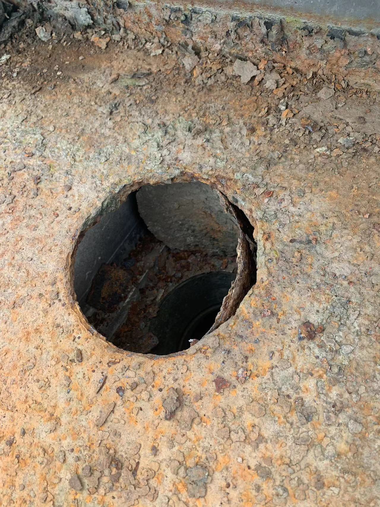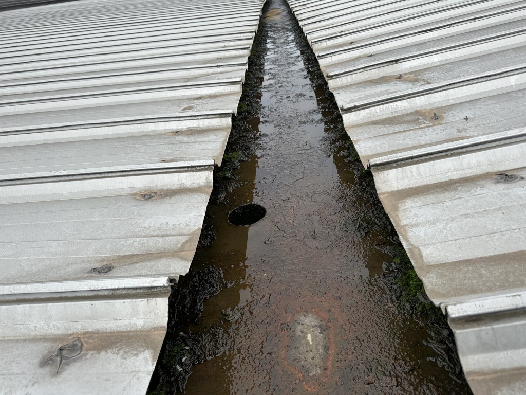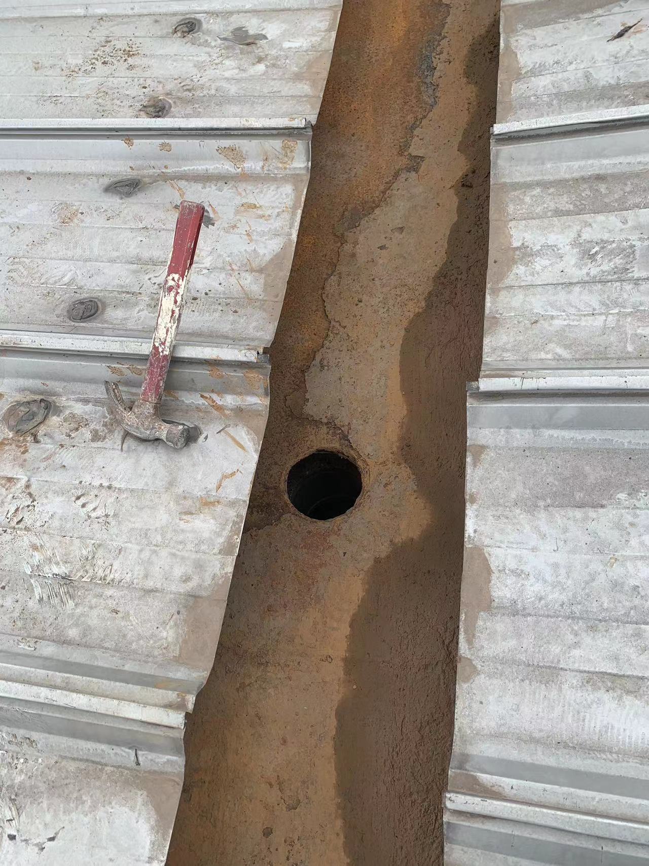 該廠房的彩鋼頂天溝在長期受到酸雨侵蝕下,天溝內個別下水管口銹蝕爛掉,導致雨水在降雨時從漏斗旁滴落,造成下水管周邊漏雨。同時,天溝內部的鐵板也出現了嚴重的銹蝕現象,已經出現起殼脫層,如果不及時處理,天溝可能會銹蝕穿孔,導致漏水,對廠房的生產設備及安全生產構成威脅。