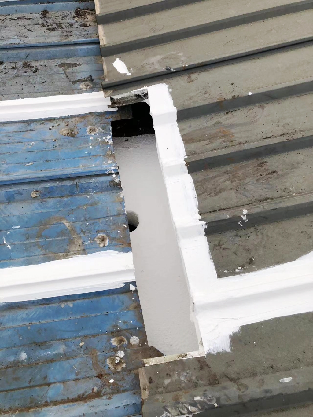 對(duì)于彩鋼頂斜坡表面彩鋼搭接縫的漏水問(wèn)題,公司同樣采用了SYR金屬屋面專用防水涂料配合專用縫織聚酯布進(jìn)行一布三涂的施工處理。這種施工方法不僅能夠有效密封搭接縫隙,防止水分滲透,還能夠提高彩鋼頂?shù)恼w防水性能。