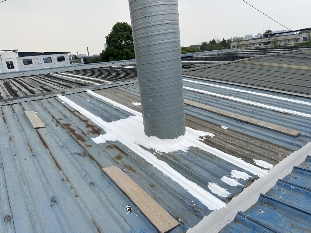 在施工過(guò)程中,公司技術(shù)團(tuán)隊(duì)首先揭掉了天溝內(nèi)的瀝青防水卷材,發(fā)現(xiàn)下方天溝已經(jīng)銹蝕嚴(yán)重,出現(xiàn)了多處穿孔。針對(duì)這一問(wèn)題,團(tuán)隊(duì)先對(duì)天溝進(jìn)行了除銹處理,并涂刷了免除銹納米固銹劑,有效阻止了銹蝕的進(jìn)一步發(fā)展。隨后,團(tuán)隊(duì)在天溝內(nèi)涂刷了SYR金屬屋面專用防水涂料,并鋪貼了專用縫織聚酯布,以增強(qiáng)防水層的韌性和耐久性。最后,再在天溝表面涂刷了兩遍SYR金屬屋面專用防水涂料,確保防水效果達(dá)到**。