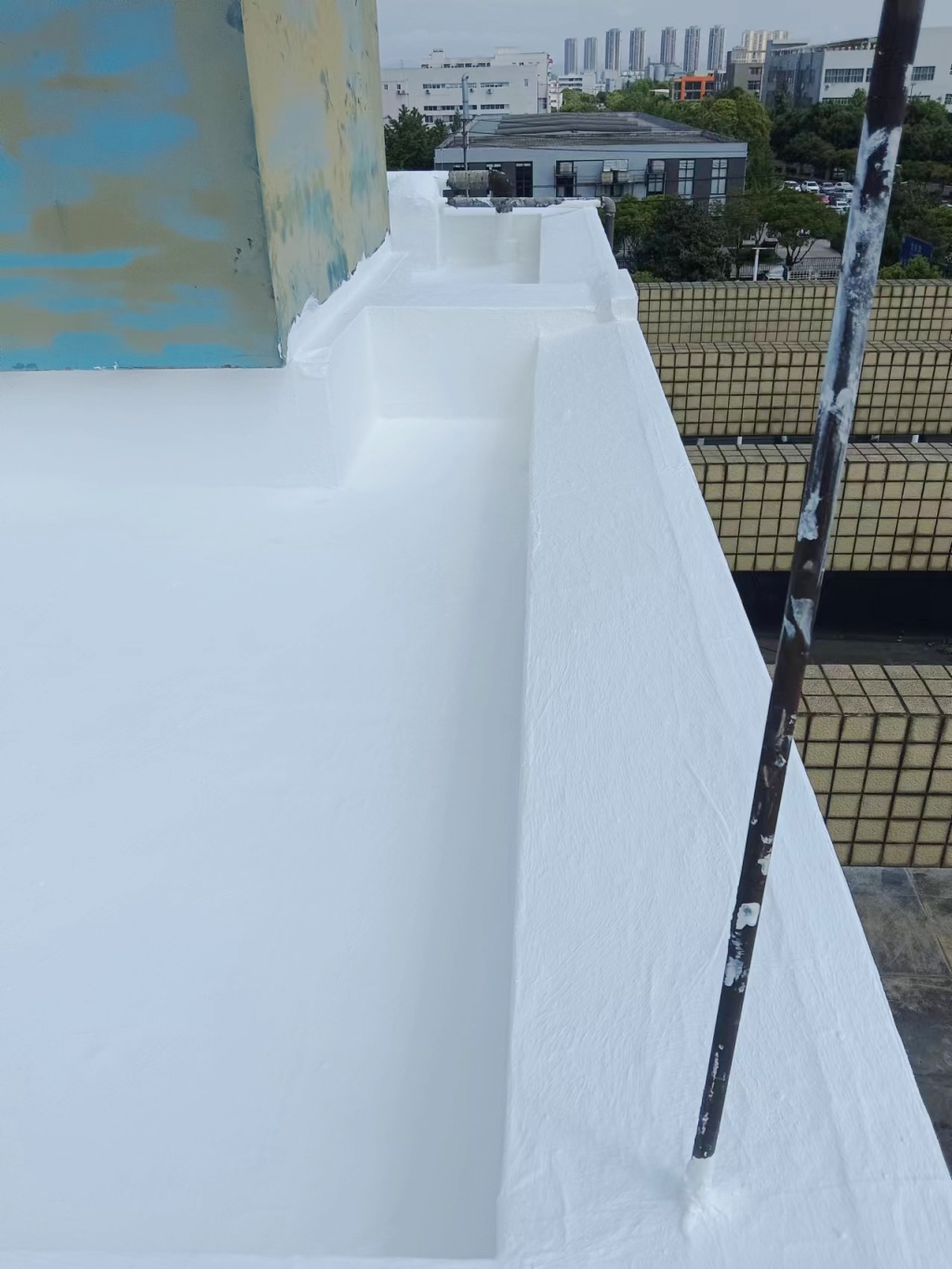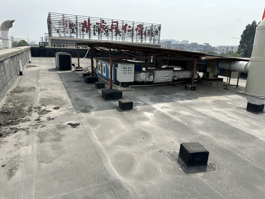 面對這一挑戰,我們采用了先進的SYR外露型無縫防水系統。在項目開始之初,我們注意到原屋頂表面覆蓋的是已經老化開裂的改性瀝青防水卷材。為了確保防水效果的長久性和可靠性,我們決定先將這些老舊的防水卷材徹底清除,并對基層表面進行細致清理,確保每一寸都干凈整潔,為后續的防水工作打下堅實基礎。
