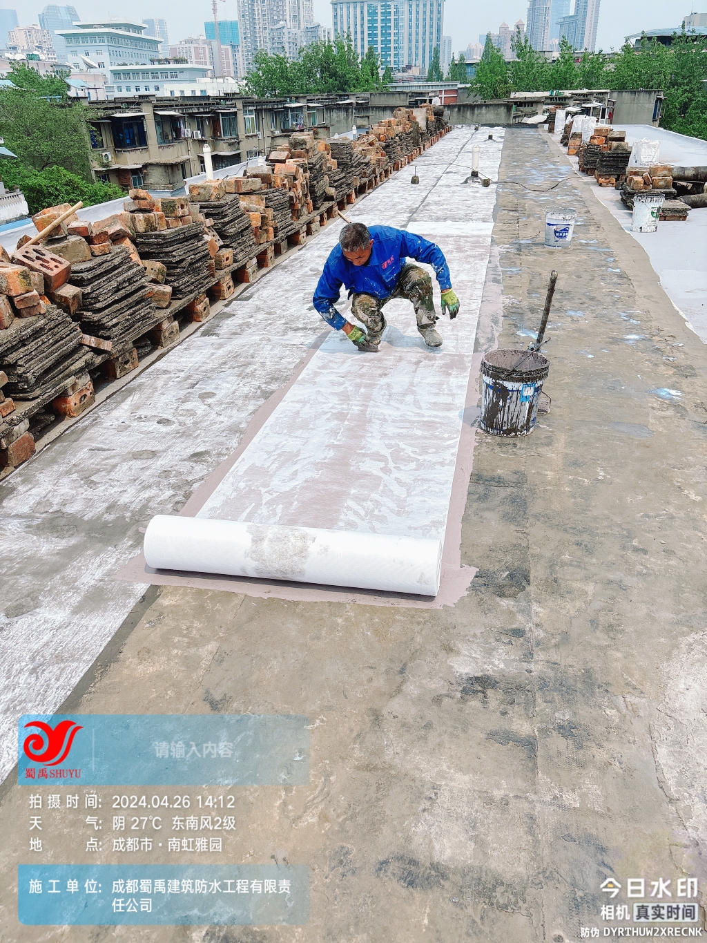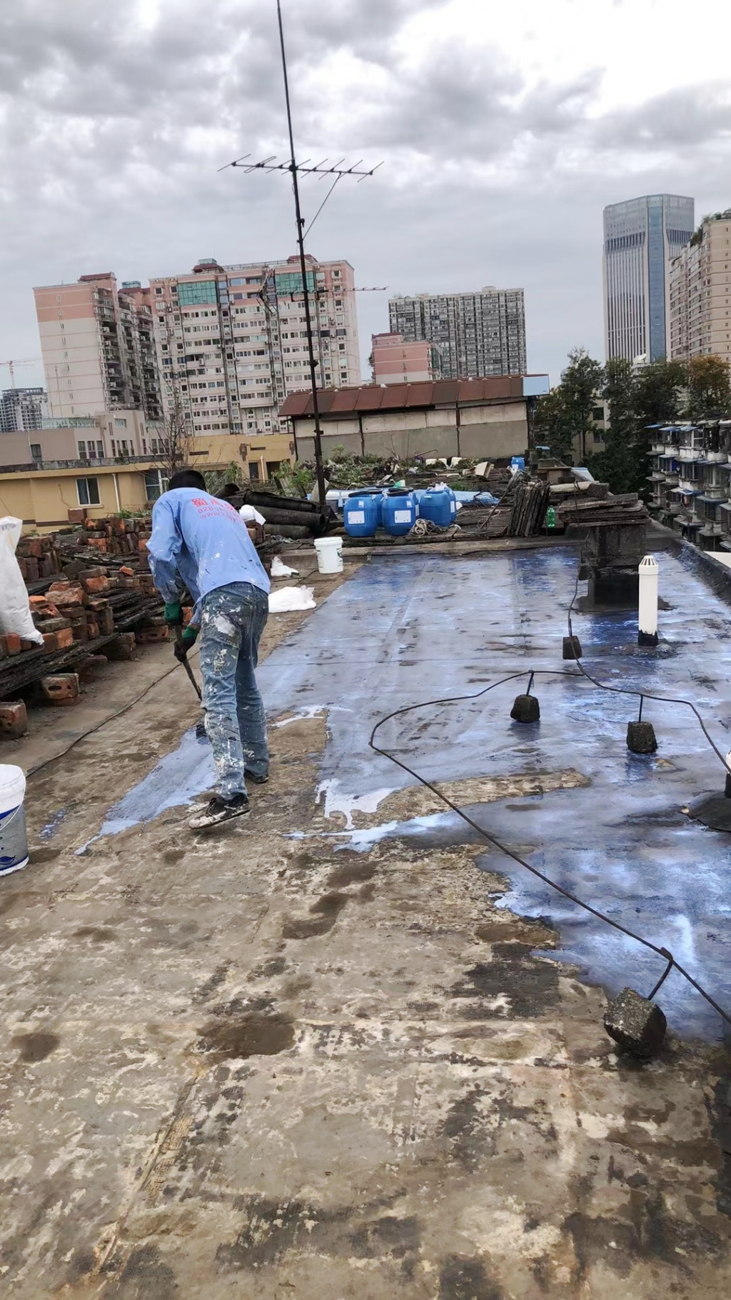 項目初期,蜀禹防水團隊首先對屋頂進行了全面的勘查與評估,隨后,施工隊伍小心翼翼地將屋頂表面的隔熱板逐一揭開,并將下方的磚塊逐一搬開,確保施工區域完全暴露且基層干凈無雜物。這一步驟雖然繁瑣,但為后續的防水處理奠定了堅實的基礎。
