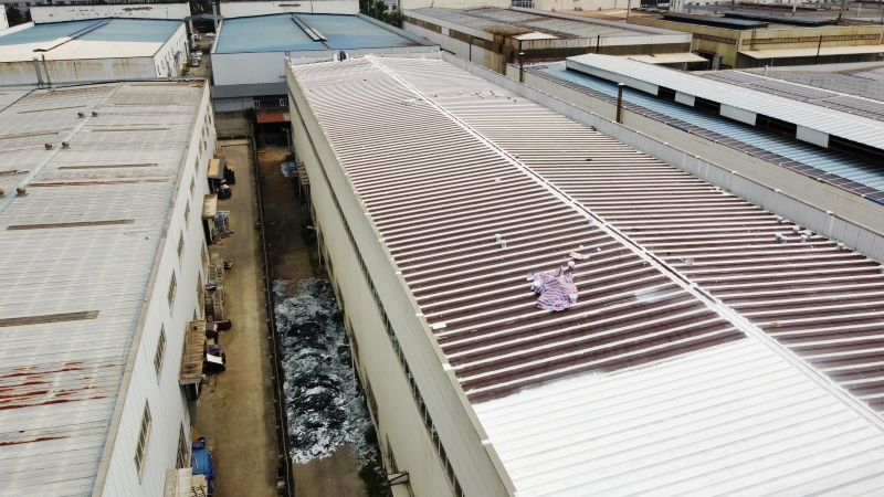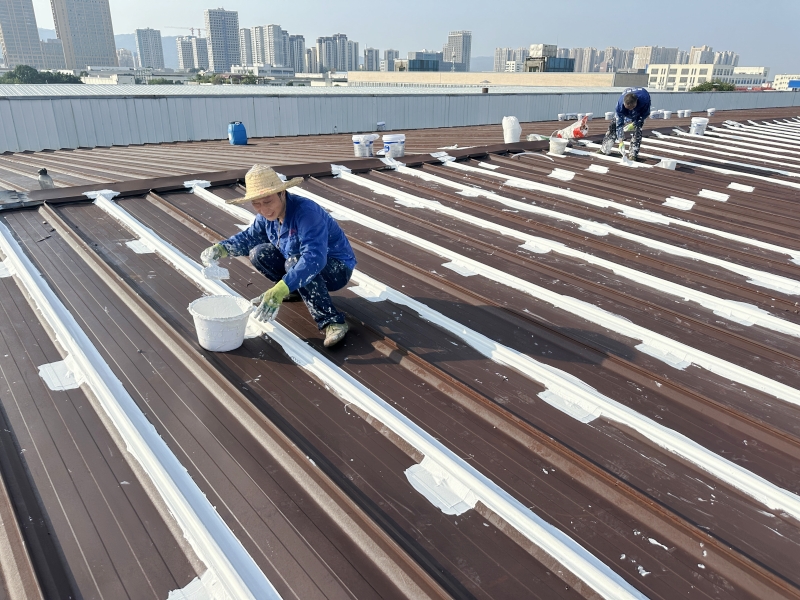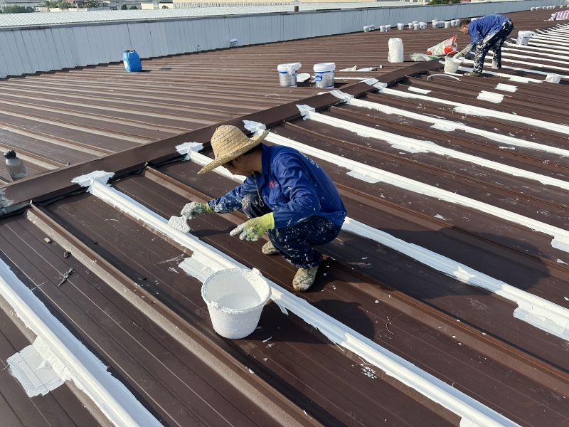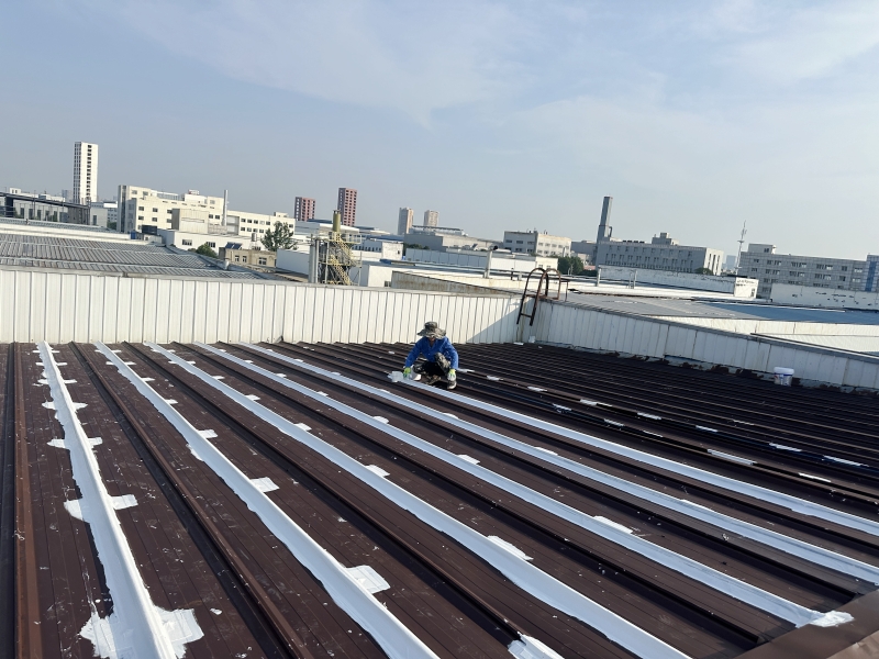 全面防水防腐翻新:整個彩鋼頂屋面滿涂SYR金屬屋面專用防水涂料進行防腐翻新,待干后再涂第二遍,形成雙重防護層,延長了彩鋼頂?shù)氖褂脡勖?/p>