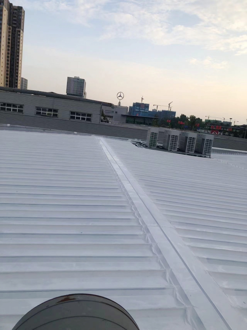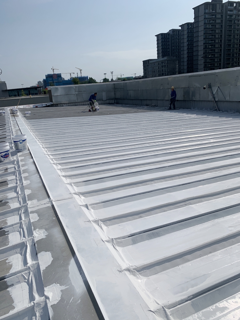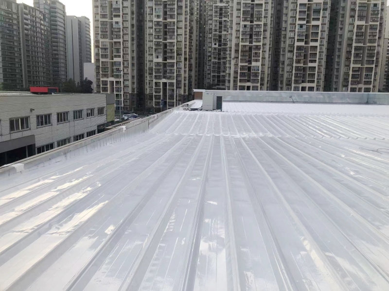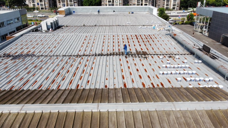 在完成關鍵部位的防水補漏處理后,蜀禹防水公司的團隊對整個彩鋼頂表面進行了滿噴涂SYR金屬屋面防水涂料的防腐翻新施工。這種涂料不僅具有良好的防水性能,還具有出色的防腐性能,能夠有效保護彩鋼瓦表面不受腐蝕和氧化的侵害。通過滿噴涂施工,彩鋼頂表面的涂層均勻、美觀,且具有較強的附著力和耐久性,能夠長期保持建筑的良好狀態。