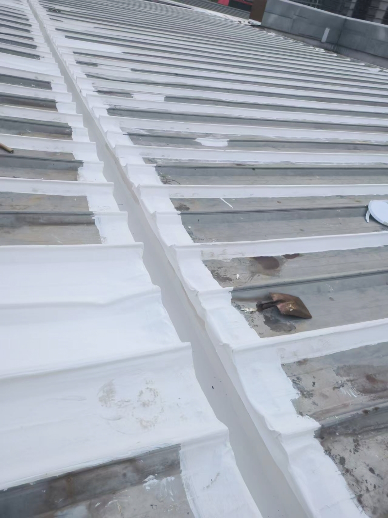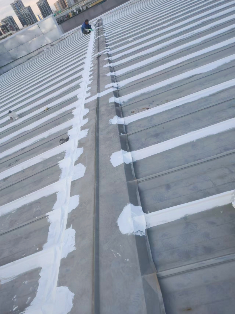 在施工過程中,蜀禹防水公司的專業團隊首先對彩鋼頂表面的彩鋼瓦搭接縫、固定螺釘以及天溝等關鍵部位進行了重點處理。他們采用SYR金屬屋面防水涂料配合縫織聚酯布進行防水補漏處理,這種材料具有優秀的防水性能和耐久性,能夠有效隔絕雨水對彩鋼頂的侵蝕。同時,縫織聚酯布的加入還增強了防水層的強度和韌性,提高了整體防水效果。