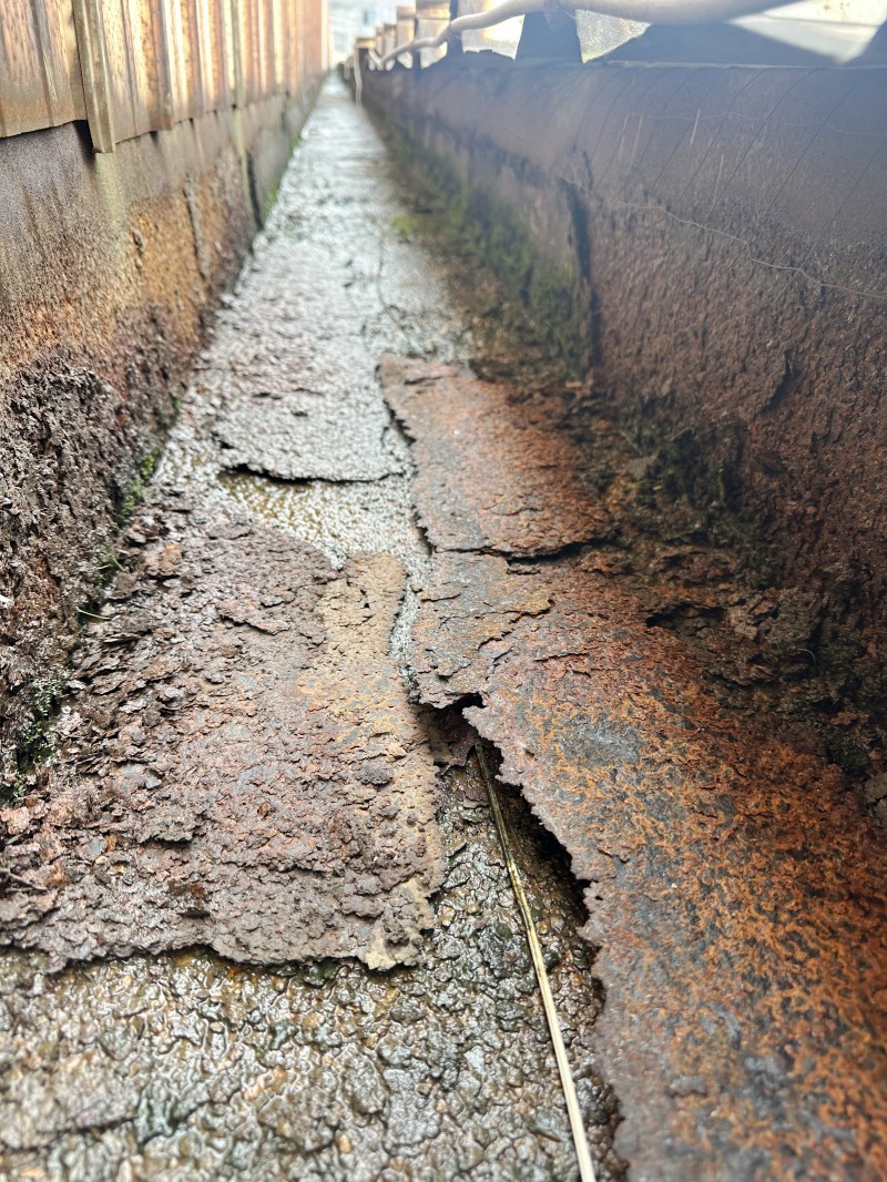 在施工前,蜀禹防水公司的專業團隊首先對廠房的彩鋼瓦屋面和天溝進行了徹底的清理。他們清除了表面的污垢、銹跡和舊防水層,確保基面干凈、平整,為后續的防水施工打下了堅實的基礎。
