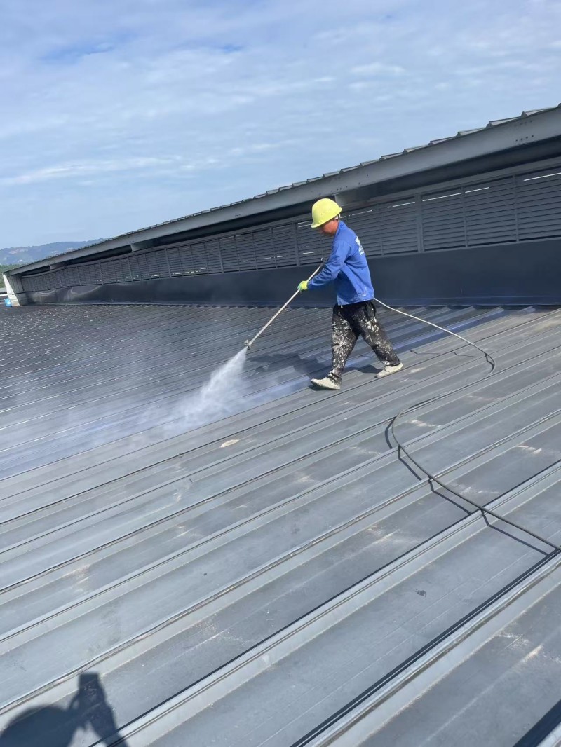 基面預處理:先對 3 號廠房彩鋼頂表面進行全面清掃,清除灰塵、雜物及松動銹蝕層,確?;娓蓛羝秸?;隨后滿噴涂一遍納米固銹劑,通過納米滲透技術固化基面銹蝕,防止銹跡擴散,為后續防水涂層建立穩固基礎。